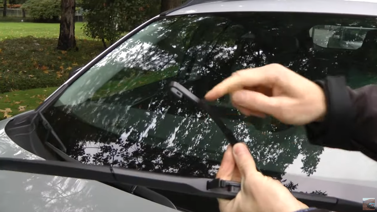 ワイパーの下部にある小さなクリップを見つけ、押し下げて、ワイパーブレードを同時にフックからスライドさせます。